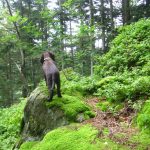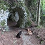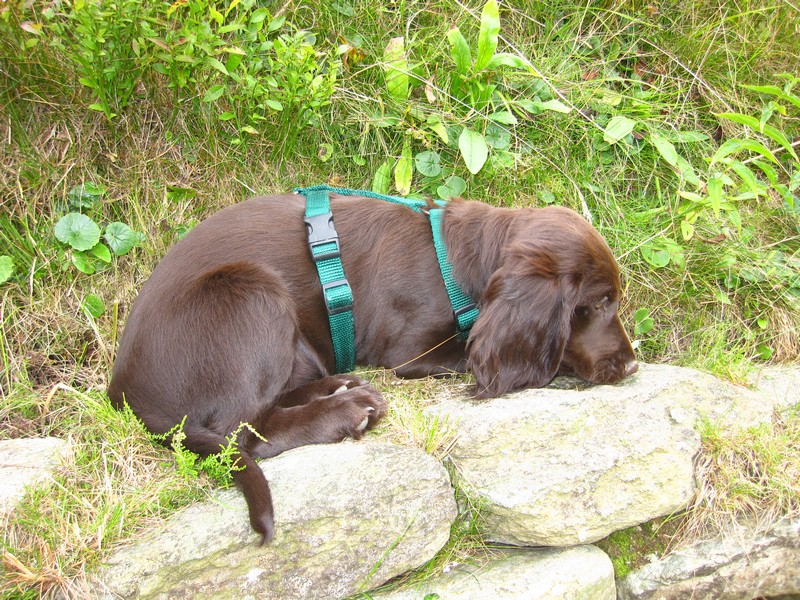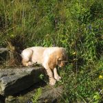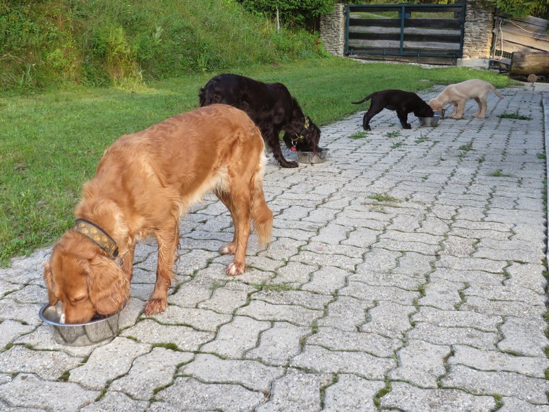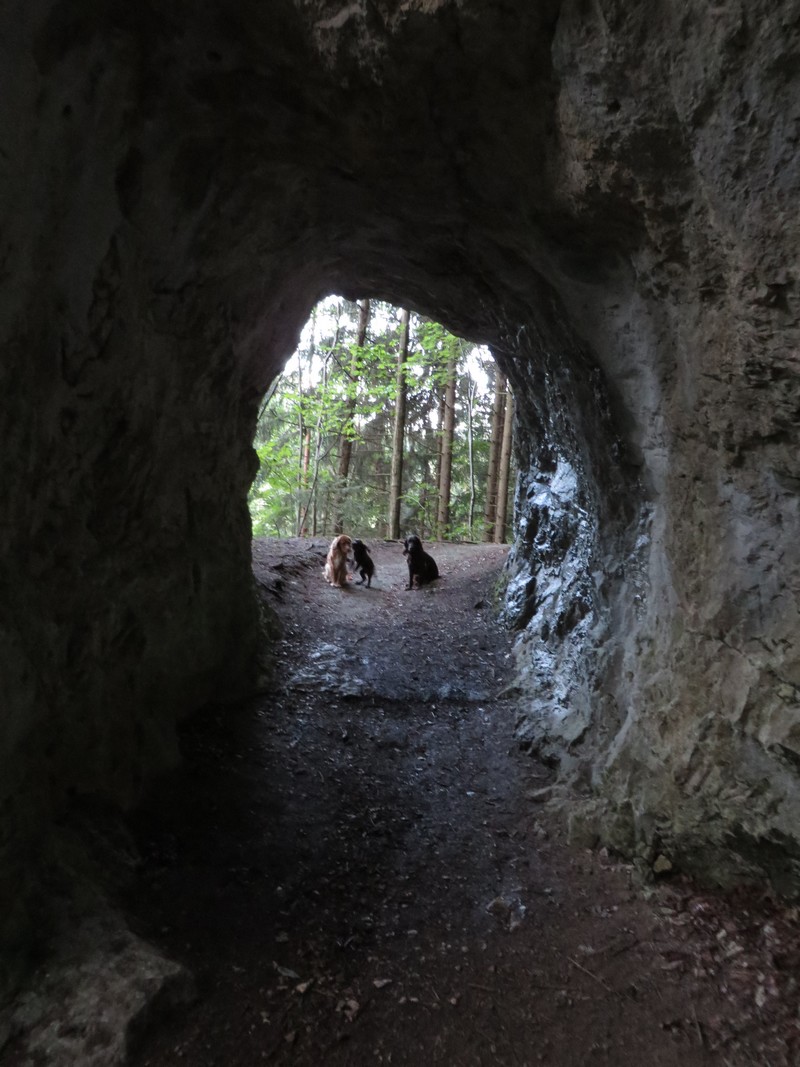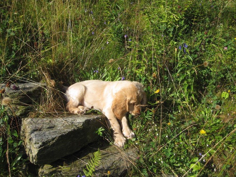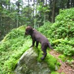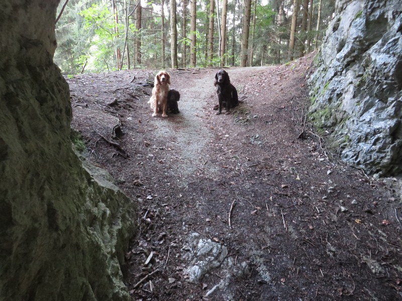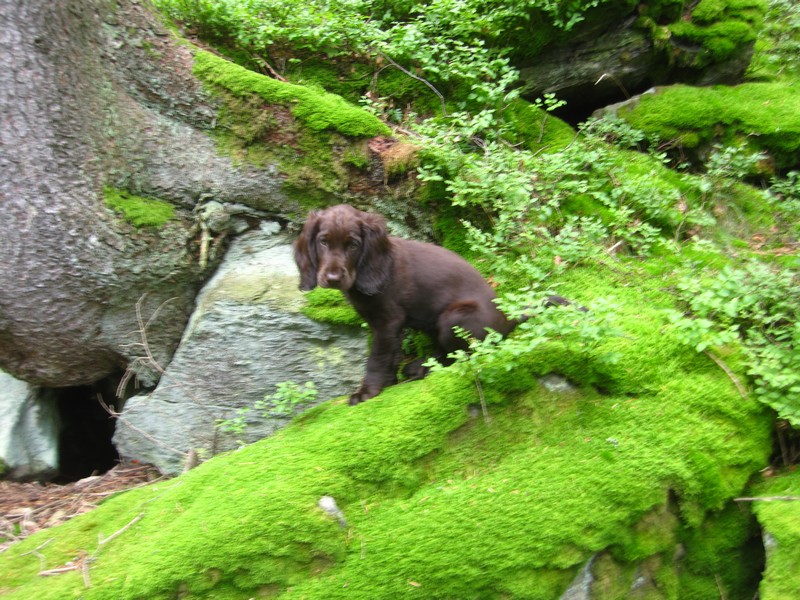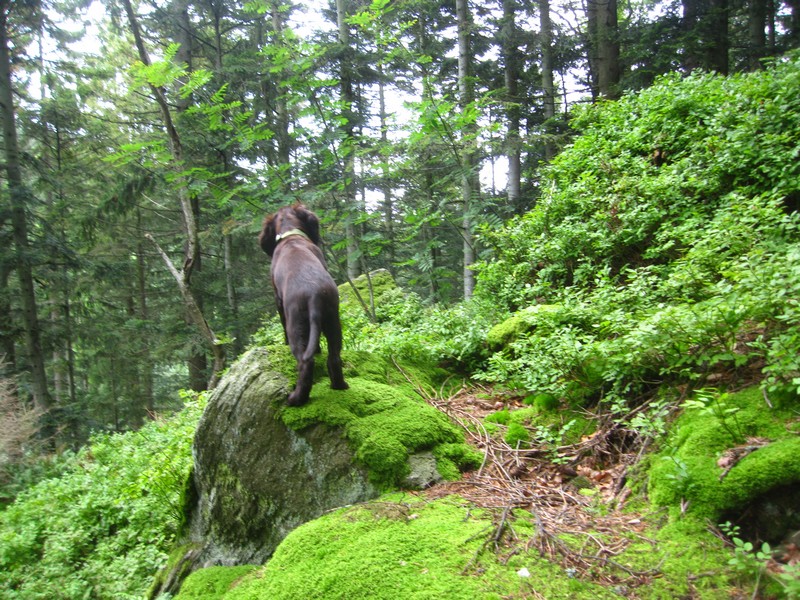 Später am Abend sind wir nochmal durch die Gartentür gegangen, Zeder legt los und ist im Nu im Wald verschwunden. Nanu? Hatte ich mir doch fast gedacht, sie ist noch mal dahin, wo die Beute gelegen hat um alles genau zu untersuchen, ob sich nicht doch noch was findet.