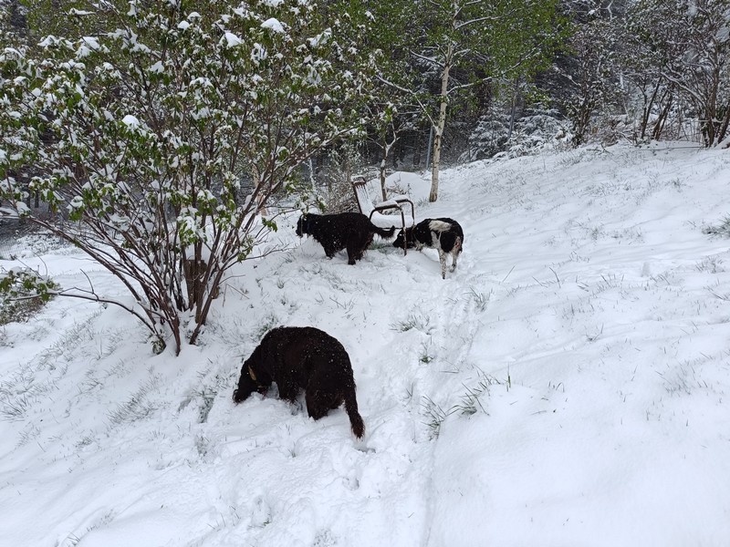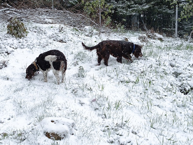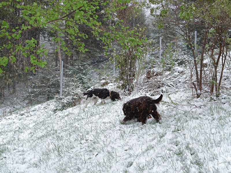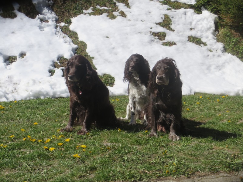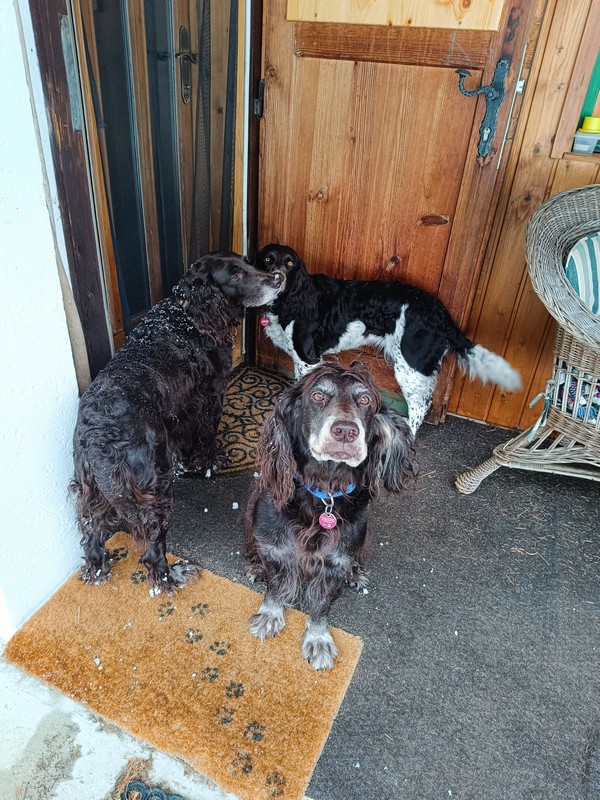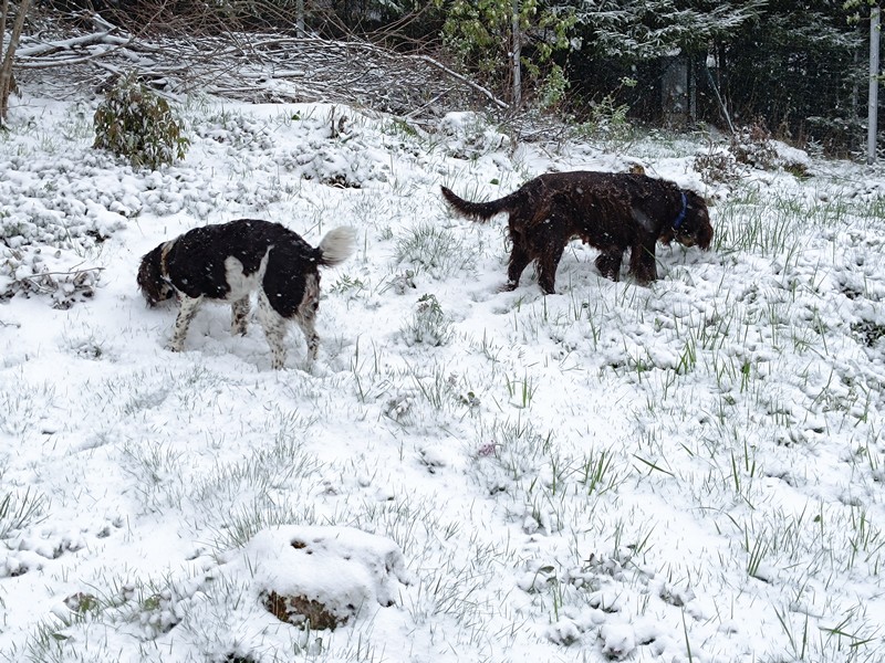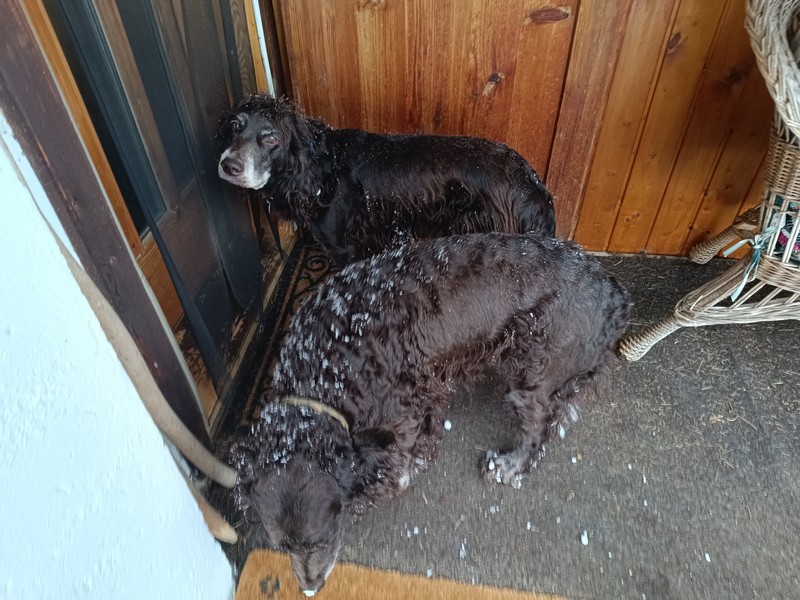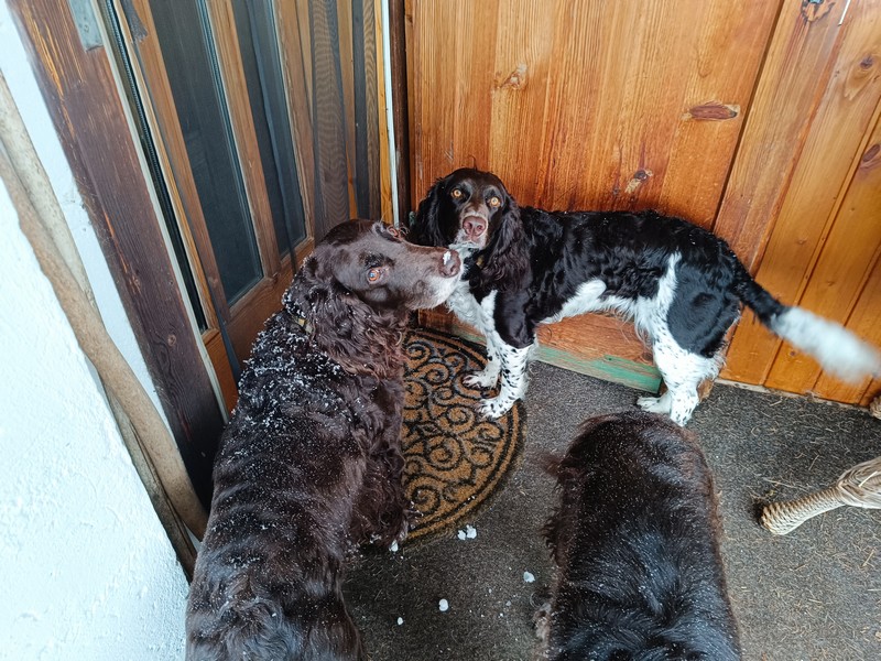 Heute morgen um sechs Uhr wurden die Hunde wie üblich wach und wollten raus. Dann standen wirklich alle drei unterm Vordach „was ist das für ein weisses Zeug? da wollen wir nicht rein!“
