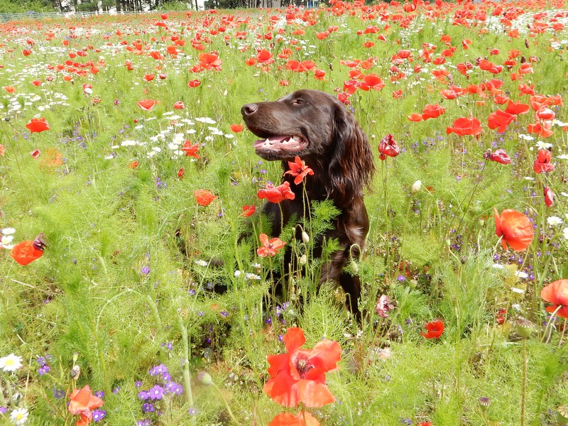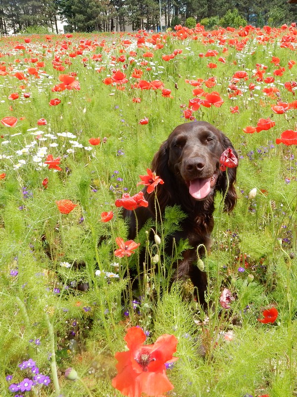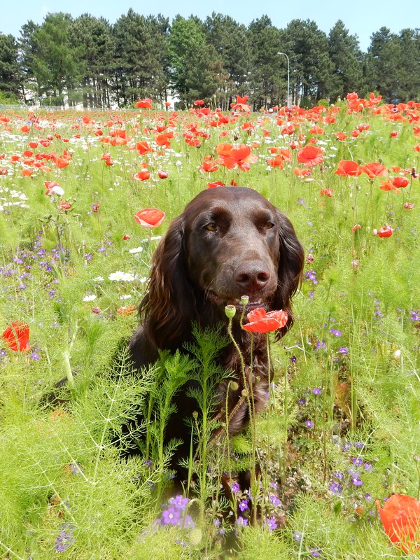 Als wir kurz darauf ins Revier fahren, sind die beiden Nilgänse auf dem Acker neben der Strasse. Die sind öfter in der Grube am Wasser. Vermutlich hat Zeder die verfolgt und ist dabei durch den Teich geschwommen, sonst hätte sie nicht durch und durch nass sein können. Sie ist dann unter dem Steilhang ausgestiegen, die Gänse sind entfleucht – und für den Rückweg durchs Wasser war es ihr dann doch wohl zu kalt.