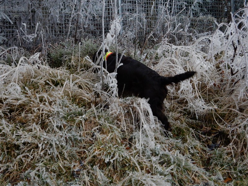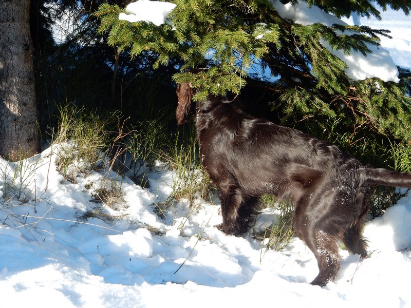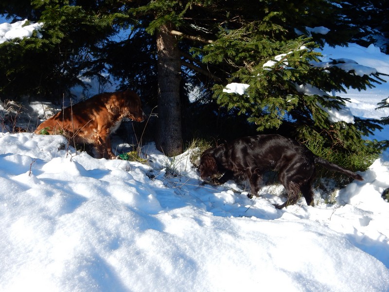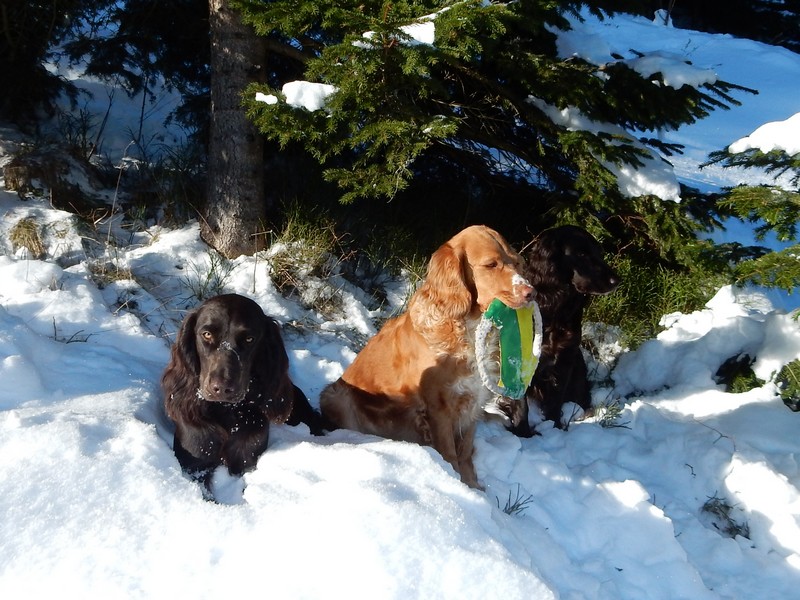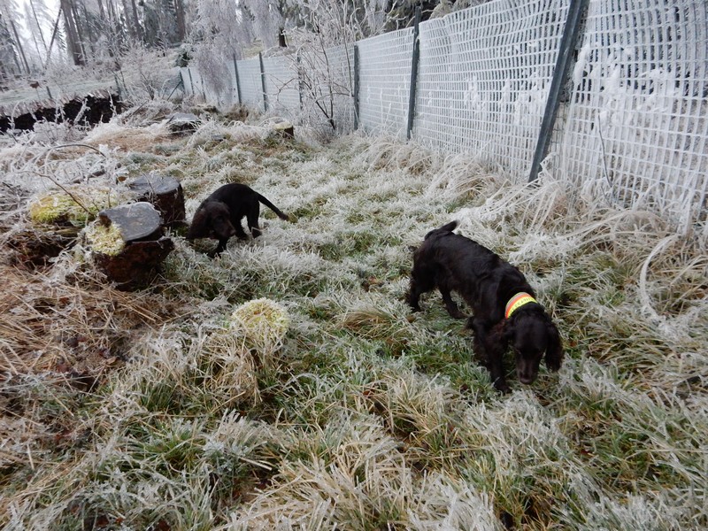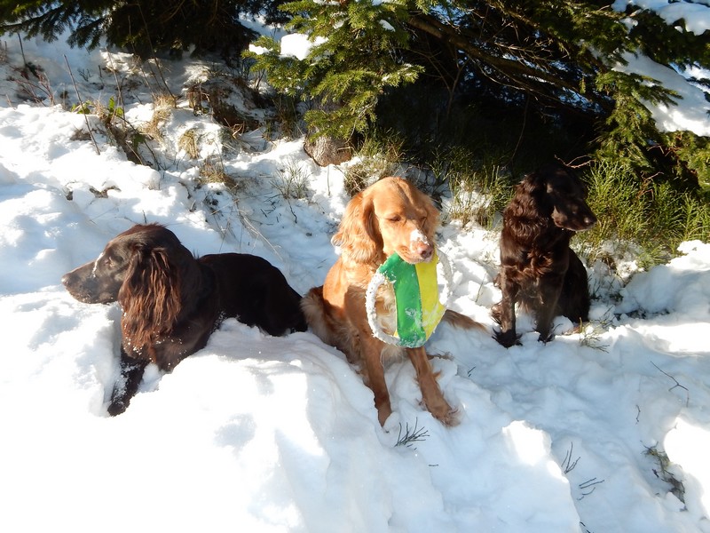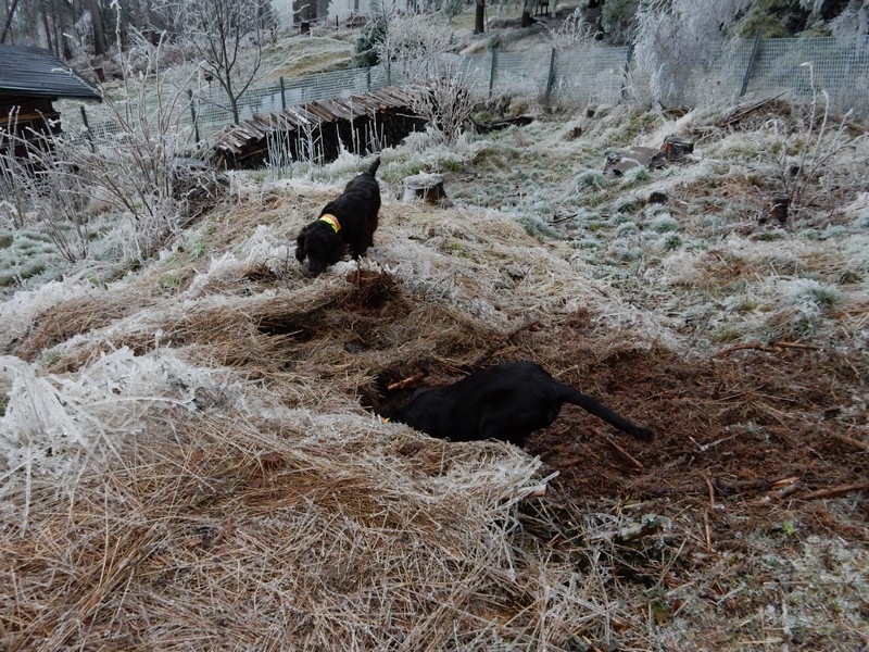 Am Hubertustag bin ich mitgefahren. Ich musste zwar im Auto warten, aber das Fenster war auf und ich hab genau gehört, wie Mama die Wildschweine durcheinander gejagt hat und wie es lustig geknallt hat. Als sie wiederkam durfte ich an ein paar Frischlingen schnuppern und hab die mal richtig angebellt.